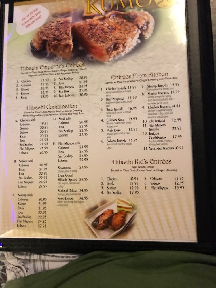 Introducing Kumo Japanese Steakhouse, a gem in Cape Coral, FL known for its lively Hibachi dinners. This establishment offers a unique dining experience where the chefs put on a show while preparing your meal. Customers rave about the entertainment factor, with chefs catching food in the air and squirting sake across the table. The menu boasts a variety of options, from flavorful sushi to perfectly grilled steaks. Dishes like shrimp, chicken, and rice receive high praise for taste and portion size. The atmosphere is casual and family-friendly, making it a great spot for groups and kids. With attentive service and entertaining chefs, Kumo Japanese Steakhouse is a must-visit for those looking for a fun night out with delicious Japanese cuisine.